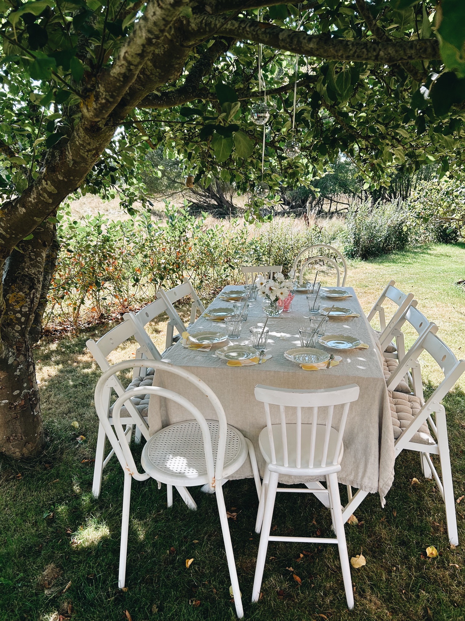 Veckan som gick var det dags för förberedelser som hette duga. Storasyster ska firas med två kalas. På lördagen bjöd vi in några av våra närmaste på napolitansk pizza och chokladpavlova. Dagen därpå var det äntligen dags för barnkalas. Jag hade hyrt en hoppborg som jag skickade iväg sjömannen att hämta och jag dukade under äppelträdet och förberedde fiskdamm och pysselbord där tjejerna kunde pärla egna diadem. Vips kom gästerna och tio flickor hoppade loss, skapade diadem och fikade i sensommarsolen. Det blev en riktigt fin eftermiddag.